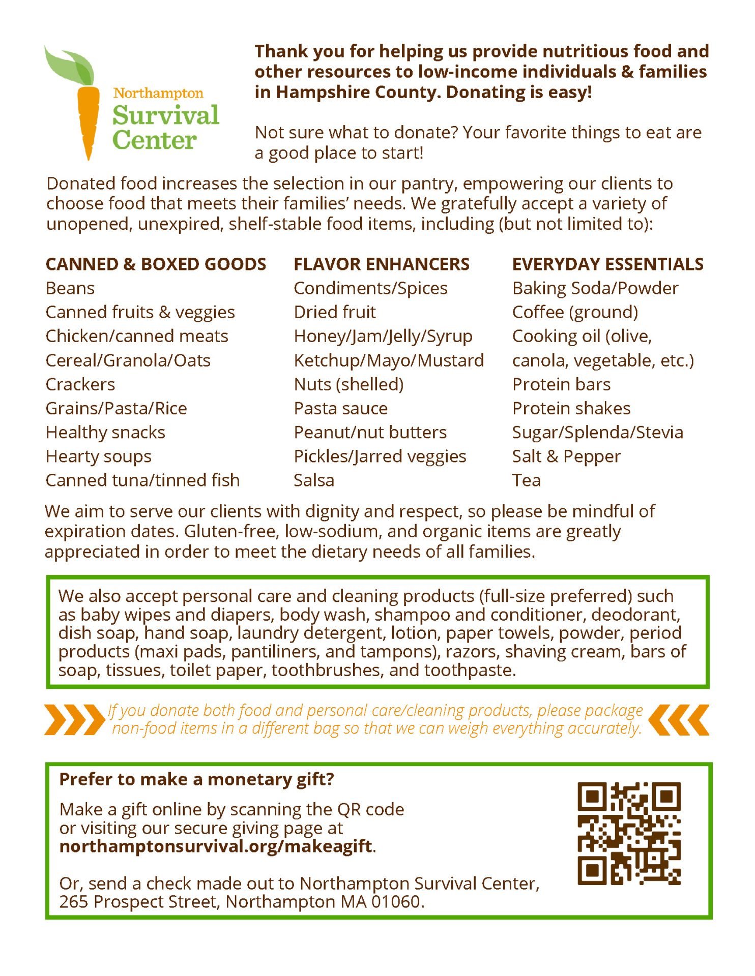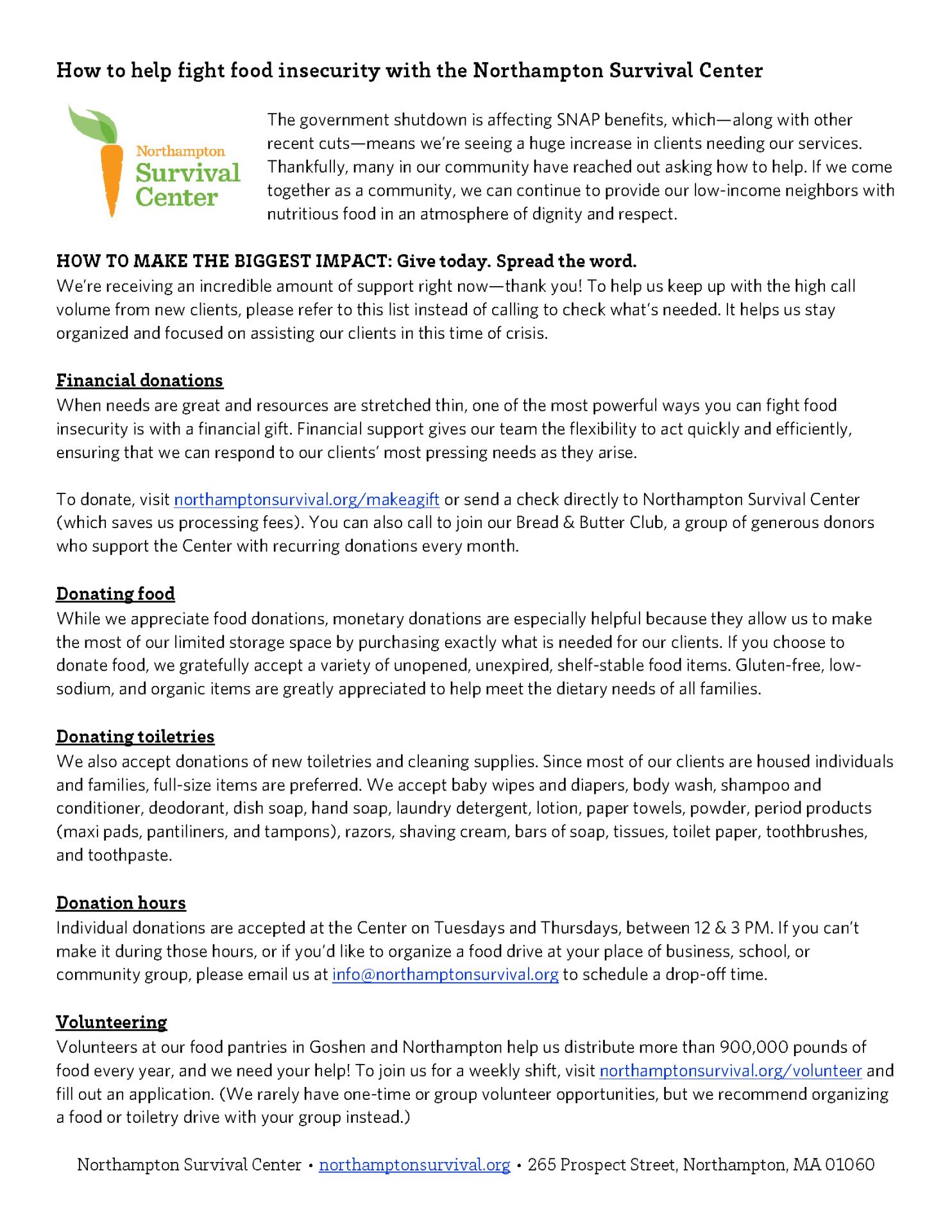 The Northampton Survival Center is dedicated to improving the quality of life for low-income individuals and families throughout Hampshire County by providing nutritious food and other resources in an atmosphere of dignity and respect.