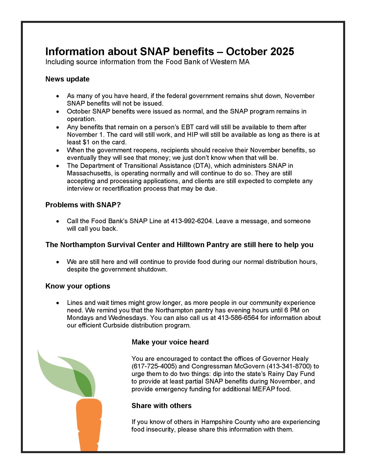 The Northampton Survival Center is dedicated to improving the quality of life for low-income individuals and families throughout Hampshire County by providing nutritious food and other resources in an atmosphere of dignity and respect.