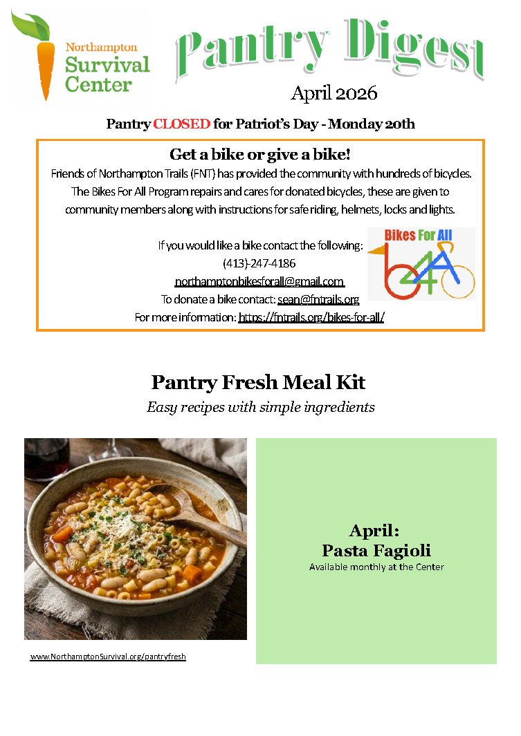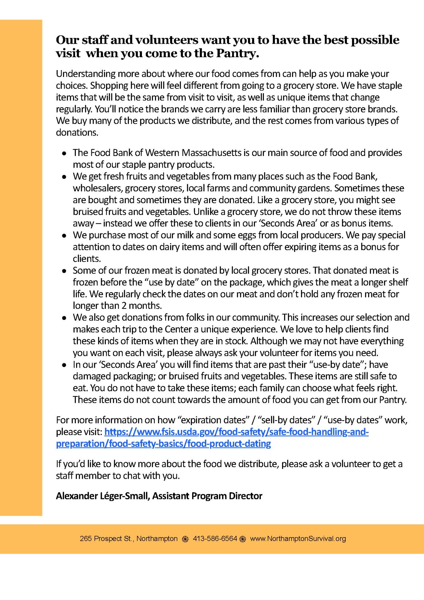 The Northampton Survival Center is dedicated to improving the quality of life for low-income individuals and families throughout Hampshire County by providing nutritious food and other resources in an atmosphere of dignity and respect.